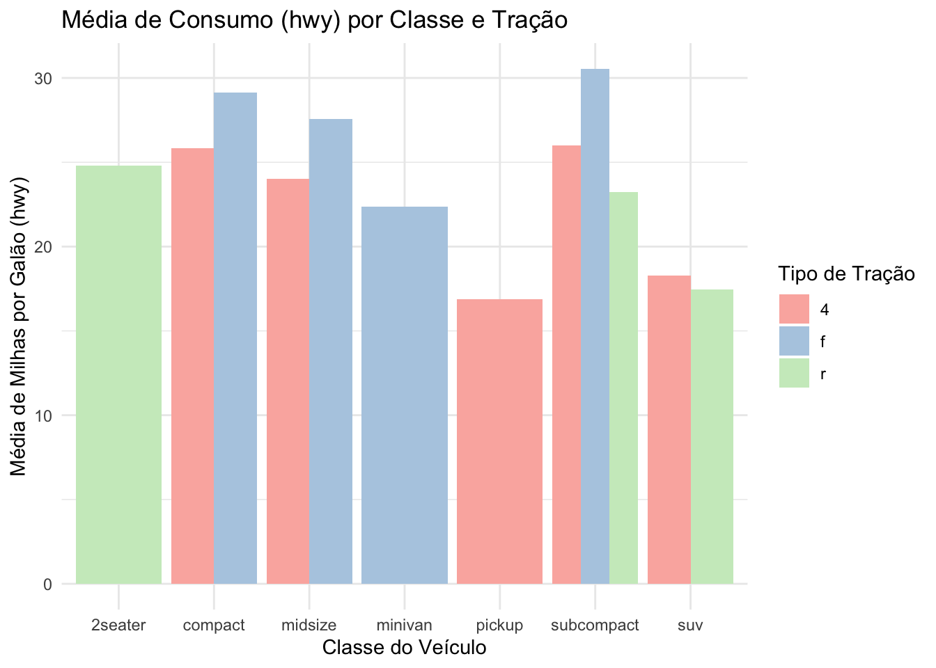 labs(title = "Média de Consumo (hwy) por Classe e Tração",