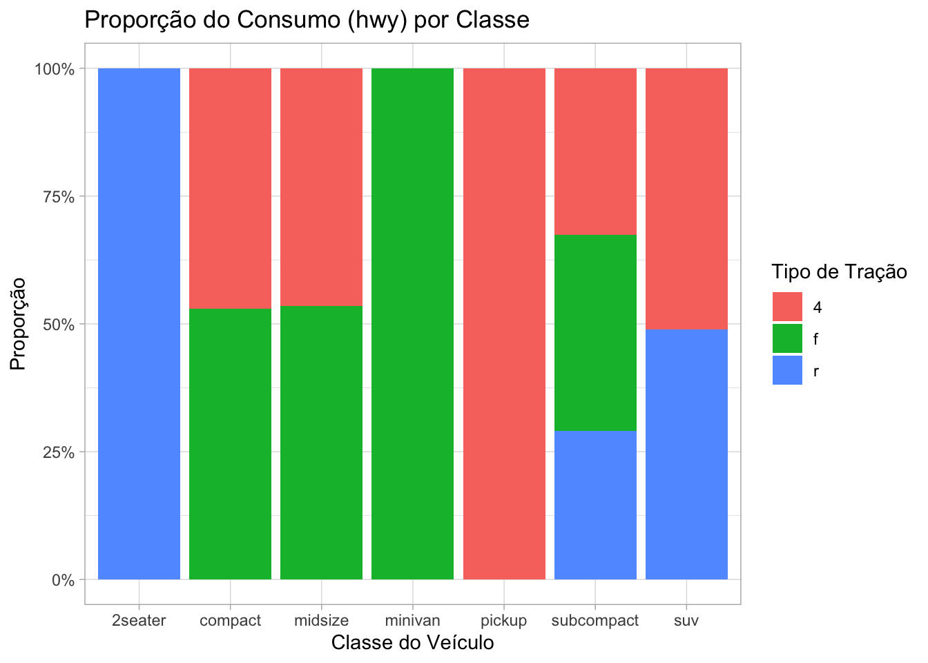 - position = “fill”: As barras são empilhadas, mas cada barra representa a mesma proporção em relação à sua própria altura total.