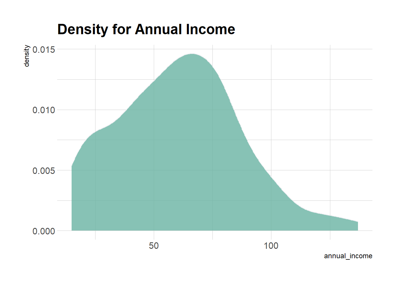 geom_density(aes(x = annual_income), fill="#69b3a2", color="#e9ecef", alpha=0.8) +