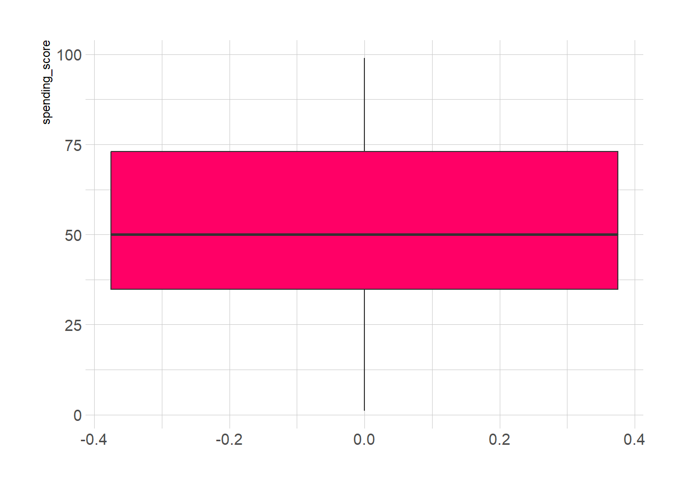 ## 1.00 34.75 50.00 50.20 73.00 99.00ggplot(mall_customers, aes(y = spending_score)) +