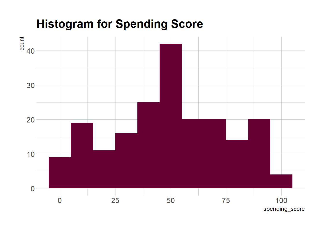 geom_histogram(aes(x = spending_score), binwidth = 10, fill = "#660033") +