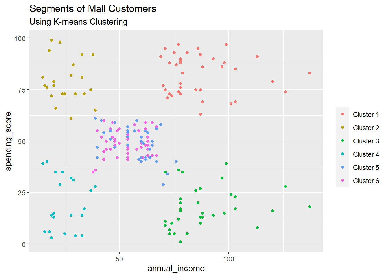 ggtitle("Segments of Mall Customers", subtitle = "Using K-means Clustering")