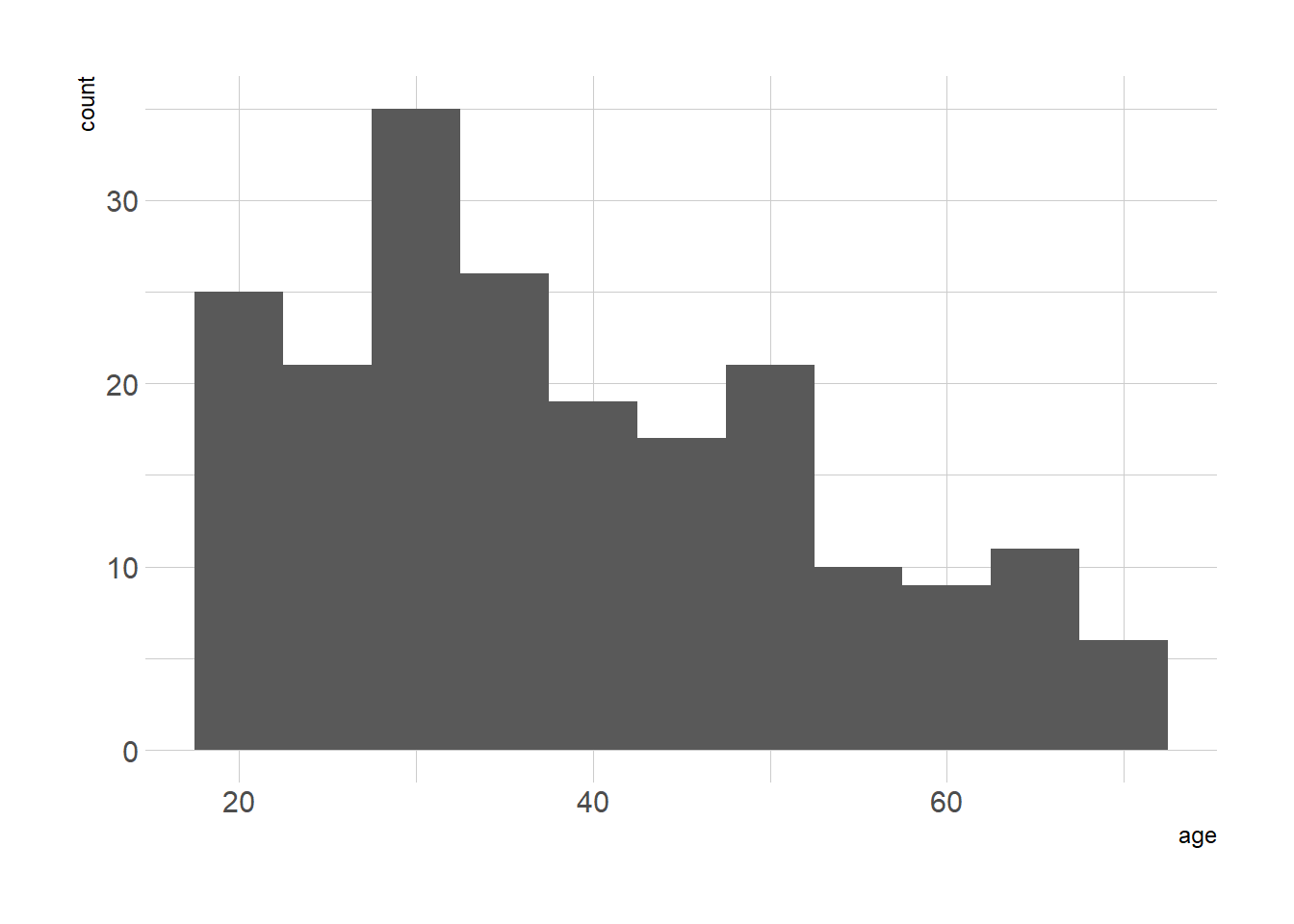 ## 18.00 28.75 36.00 38.85 49.00 70.00ggplot(mall_customers, aes(x = age)) +