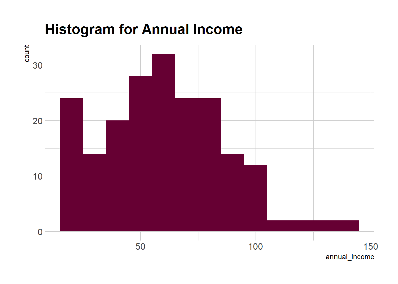 geom_histogram(aes(x = annual_income), binwidth = 10, fill = "#660033") +